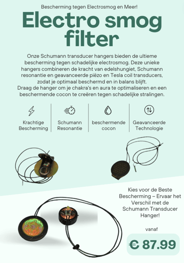 Onze Schumann transducer hangers bieden de ultieme bescherming tegen schadelijke electrosmog. Deze unieke hangers combineren de kracht van edelshungiet, Schumann resonantie en geavanceerde piëzo en Tesla coil transducers, zodat je optimaal beschermd en in balans blijft.